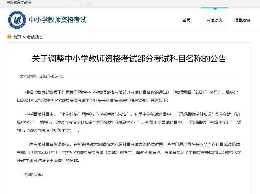 根据《教育部教师工作司关于调整中小学教师资格考试部分考试科目名称的通知》(教师司函〔2021〕14号),自2021年6月起对中小学教师资格考试小学社会等科目名称进行相应调整,具体如下: